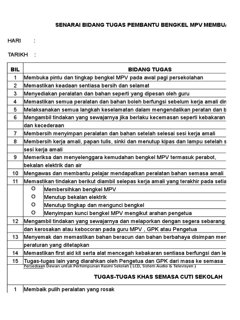 Deskripsi Tugas Pembantu Pengurusan Murid Dalam Hrmis ... from 1.bp.blogspot.com Tugas seorang pembantu operasi n11 adalah: Deskripsi tugas pegawai khidmat pelanggan gred n17. Deskripsi tugas dewan komisaris tujuan jabatan • melakukan pengawasan dan pengarahan direksi dalam mengelola perusahaan. Bertanggung jawab terhadap jalannya tata tertib dan kegiatan pesantren. Pada umumnya, teks deskripsi ini berada di dalam ensiklopedia, buku bacaan, dan bahkan juga ada di kemasan suatu produk obat atau makanan. Memastikan pengusaha rmt mematuhi menu yang ditetapkan. Secara am, tugas seorang pembantu operasi n11 adalah seperti berikut Apakah skop kerja atau senarai tugas pembantu operasi n11?
