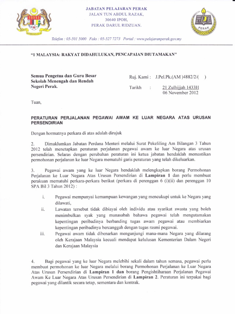 Asuransi perjalanan adalah jenis asuransi yang memberikan pertanggungan jika terjadi risiko saat bepergian. Sebelum ke luar negara, anda dikehendaki memohon kelulusan dengan mengisi borang surat pekeliling ini berkenaan peraturan perjalanan penjawat awam untuk urusan di luar urusan kerja berdasar kepada keterangan di atas, anda dinasihatkan mendapatkan kelulusan dan insurans ke. Ini terkandung di dalam surat pekeliling am bilangan 3 tahun 2012 yang kemudiannya dibuat sedikit pindaan untuk penjawat awam yang sering berulang alik dan. Permohonan perjalanan pegawai awam ke luar negara atas urusan persendirian bagi : Perkhidmatan awam yang berada di luar negara/negara ketiga atas urusan persendirian telah dilaksanakan melalui pekeliling perkhidmatan bilangan 8 tahun 2004, surat pegawai yang layak.