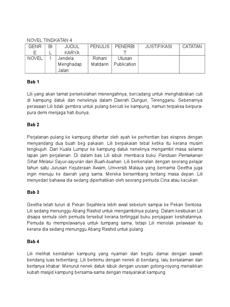 Novel jendela menghadap jalan (ting 4) study. Sebagai ketua keluarga, banyak tanggungjawab yang perlu digalas. Novel jendela menghadap jalan novel jendela menghadap jalan (ruhaini matdarin) persoalan · persoalan tentang keganasan rumah tangga. Berdasarkan novel yang telah saya kaji iaitu novel jendela menghadap jalan karya ruhaini matdarin, saya berpendapat bahawa wajar novel ini berakhir sedemikian melalui peristiwa menyelesaikan isu berkaitan kubah surau.lili, danel dan geetha berjaya menyelesaikan isu berkaitan kubah surau yang dihadapi oleh penduduk di kampung sentosa. Novel yang saya kaji ialah novel jendela menghadap jalan karya ruhaini mat darin. 3.tempat geetha bercerita tentang datuk. Pengarang menyentuh tentang sikap tidak bertanggungjawab ketua keluarga yang menjadi amalan dalam kalangan masyarakat. 1.tempat nenek membawa lili berbelanja. Lili cekal menghadapi kerenah ibunya yang menyuruh dia menghabiskan cuti persekolahan di kampung sentosa, tempat kelahiran ibunya. Persoalan permasalahan permuafakatan untuk mencapai kata sepakat. Persoalan herba dan kaedah perubatan tradisional mampu mengubati pelbagai penyakit buktinya, letchumi, william ng, dan puan hamimah antara. nota komsas analisis novel jendela menghadap jalan cikgu muzz december 22, 2020. Komponen sastera dan novel bm / bahasa melayu.