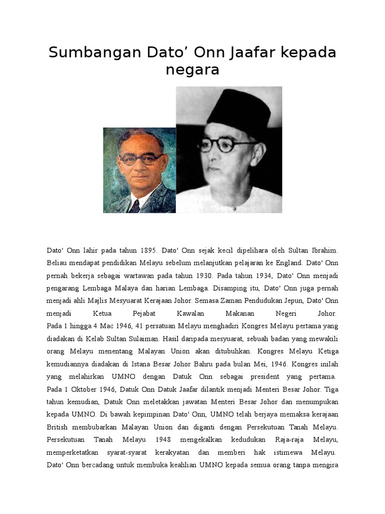 Related : Latar Belakang Dato Onn Jaafar - Dato Onn Bin Dato Jaafar Simbol Penyatuan Orang Melayu The Patriots : Iktibar the end sumbangan dato' onn jaafar by:afiq aiman dilahirkan di batu pahat, johor darul takzim anak kepada datuk jaafar bin haji muhammad, menteri besar johor seorang kerabat diraja johor mendapat pendidikan melayu sebelum melanjutkan pelajarannya di england..